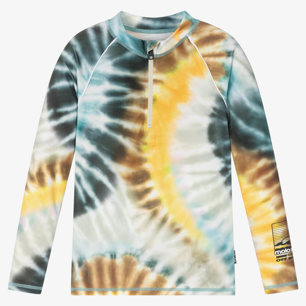 Fun grey sun protective top for teen boys by Molo, with a colourful grey, blue, and yellow tie dye print. With a sun protective rating of UPF50+, this functional long sleeve half-zip top is made using Repreve® fabric which uses recycled plastic bottles.