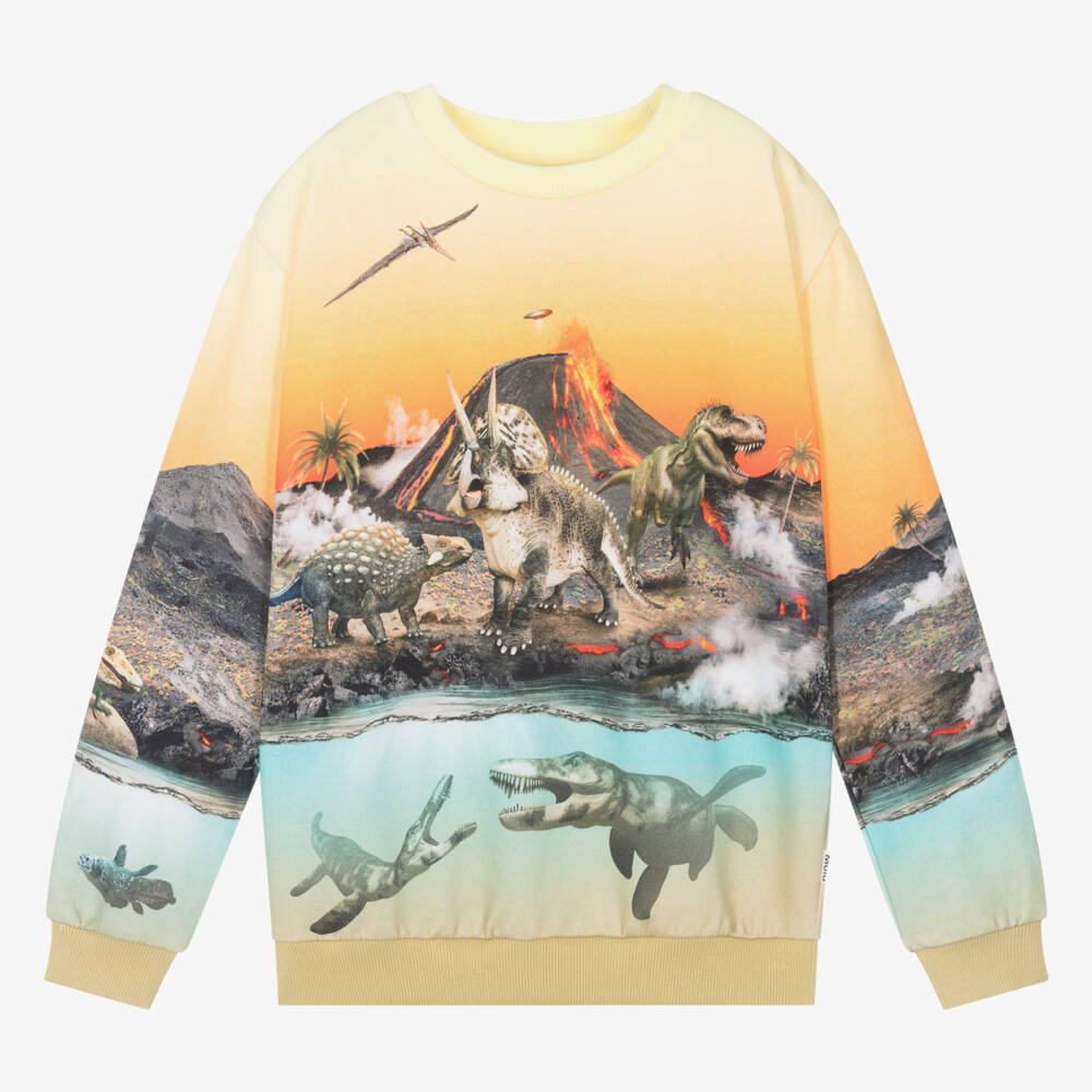 Teen boys yellow and orange organic cotton sweatshirt, designed by Molo. With a prehistoric dinosaur scene on the front and back, this long-sleeved top has a casual crew neck style and a relaxed fit.