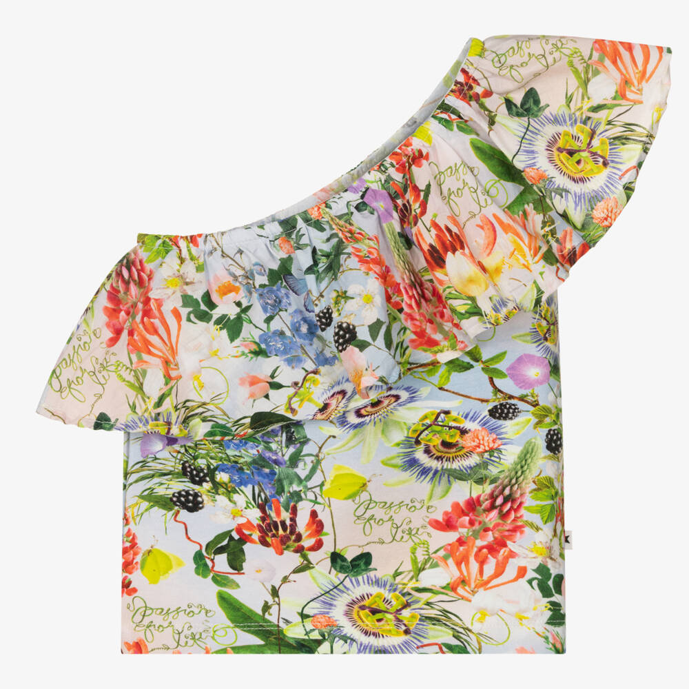 Stylish and comfortable for teen girls, this asymmetric Molo top is patterned with a colourful floral design. Made in soft organic cotton jersey, it has a statement poplin ruffle around the neckline and over one shoulder.