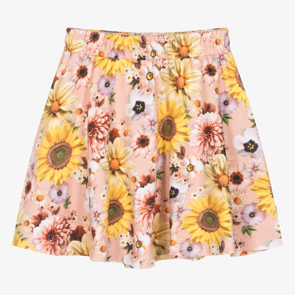Coral pink and yellow skirt for teen girls from Danish brand Molo. Designed in a beautiful, muted floral print, this full skirt has an elasticated waist and a logo tab on the side seam. Both casual and stylish, it is made in mid-weight organic cotton jersey for comfortable wear.
