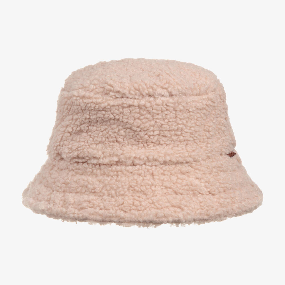 A stylish layer for cold weather styling, this pink bucket hat for teen girls is from Molo. This hat is made from sherpa fleece using recycled fibres and is decorated with a brown logo badge on the front. It is lined in the softest cotton jersey and has internal ear muffs for added warmth.
