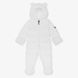 Pale blue hooded snowsuit for baby boys and girls by luxury brand Moncler Enfant, made with recycled materials. Silky smooth, it is made in a matte fabric that is both water repellent and breathable and has a beautifully soft cotton jersey lining. It is down-padded for superior warmth and comfort and fastens with a branded zip fastening on the front. The detachable mittens and booties easily attach with poppers. Soft, ivory teddy fleece across the shoulders adds a stylish touch. One sleeve has a patch pocket, accented with a branded popper and the instantly recognisable felt logo patch.