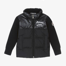 Ivory and navy blue cardigan for little boys by luxury brand Moncler Enfant, made in a ribbed virgin wool knit and enhanced with a down-padded front. A combination of textures, this warm layer has a front zip fastening, two front pockets and a gently padded collar. A Moncler Archive logo is embroidered on the chest and the iconic felt logo patch is sewn on the sleeve.