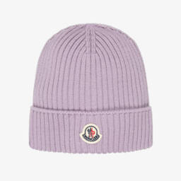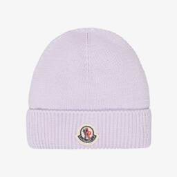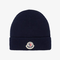 Navy blue hat for boys by Moncler Enfant, knitted in soft, luxurious virgin wool, with a large green felted logo patch on the front. The green turned-up brim is ribbed, with a blue striped trim and the brand's signature logo patch on the back for an instantly recognisable designer finish.