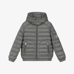 Navy blue hooded puffer jacket for little boys by luxury brand Moncler Enfant, with the iconic logo patch on the sleeve. Made and lined in the brand's super lightweight and water-repellent nylon doudoune legere, it is down padded for excellent warmth. Easy to zip up on the front, it also features elasticated cuffs to keep the chills out, a silky red lining and popper fastening front pockets.