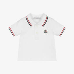 White polo shirt for boys by luxury brand Moncler Enfant, made in soft cotton piqué. Styled with a classic ribbed collar and button fastenings, this casual top has blue jersey cuffs with white striped trim and a white logo on one sleeve. The signature felted logo patch features on the chest for a distinctive designer finish.