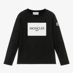 White long-sleeved top for boys by luxury brand Moncler Enfant, made in soft and stretchy cotton jersey. This casual top has a large red panel on the front with a raised black logo and 1952 underneath, the year the brand was founded. Cool and comfortable for everyday wear, the designer's signature felted logo patch also features on one sleeve.