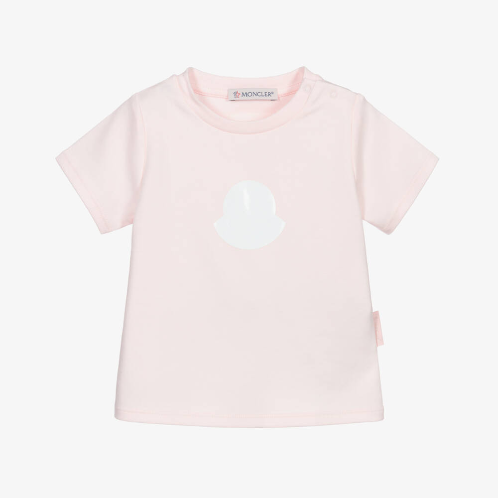 Pink cotton T-shirt for little girls by luxury French brand Moncler Enfant. It is made in soft cotton jersey, with a white logo print on the front. It has popper fastenings on one shoulder for easy dressing