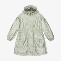 White button-up raincoat for little girls by luxury French brand Moncler Enfant, made in soft, shiny polyester. Lined in soft jersey, it has a detachable hood with front pockets and a navy blue, red and white logo patch on the chest.