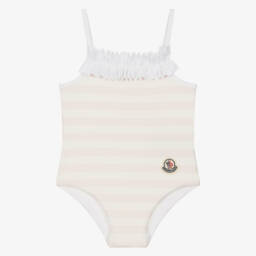Ivory and black swimsuit for teen girls by luxury French brand Moncler Enfant. In a stylish colourblock design, it has a mesh logo tape trim across the front with a tonal silicone print for a distinct finish. It is made in silky soft and stretchy fabric with a low scooped back and a full lining.