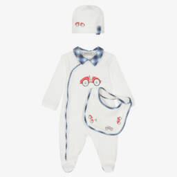 A super cute ivory babygrow and hat set for boys by Monnalisa, made in super soft and cosy cotton velour. Both pieces have adorable car appliqués on the front in grey or blue tartan, with coordinating trims. The hat has a turned-up brim and a jersey lining for comfort.