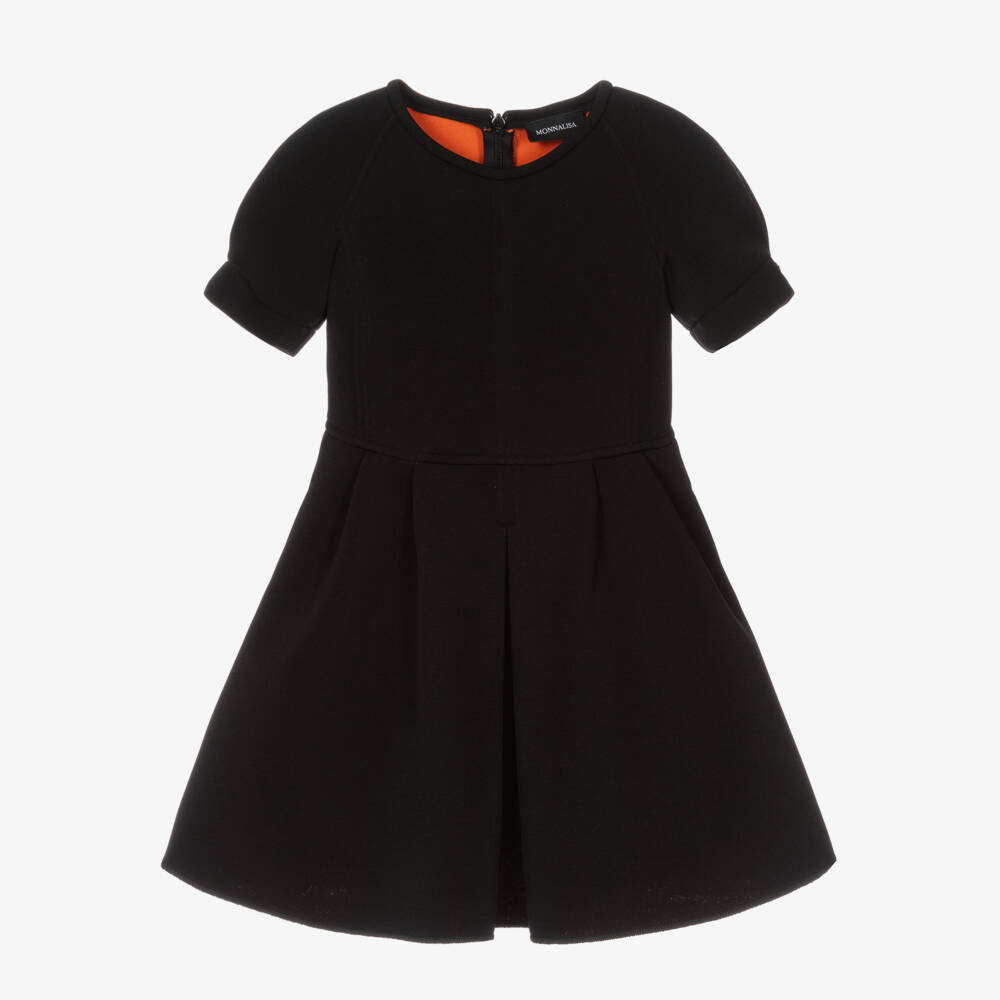 Cool black skater dress for girls by Italian brand Monnalisa, made in soft neoprene that holds it's shape well. It has a fitted bodice with overstitch detailing and full, raglan sleeves, one with a silver logo tab. The skirt is pleated and full, with useful, concealed pockets on the side seams. The dress fastens with a neat, concealed zip around the back and has a fun, contrasting orange underside.