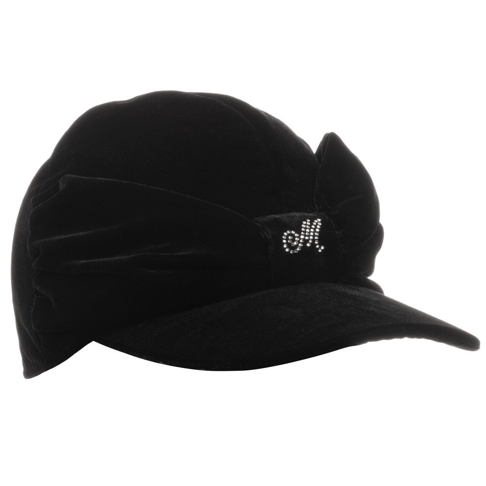 Girls black cap by Italian designer Monnalisa, made in super soft velvet. It has the brand's sparkling diamanté logo on the attached bow around the front.