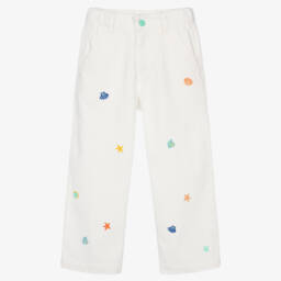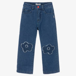 Stylish, mid-blue wide-leg jeans for girls by Monnalisa, made in soft and stretchy denim. The intricate, eyelet-inspired floral pattern embroidered above the scalloped hem and the two-tone faux pony leather patch give this five-pocket style an elevated look. They fasten with a branded button and zip on the front.