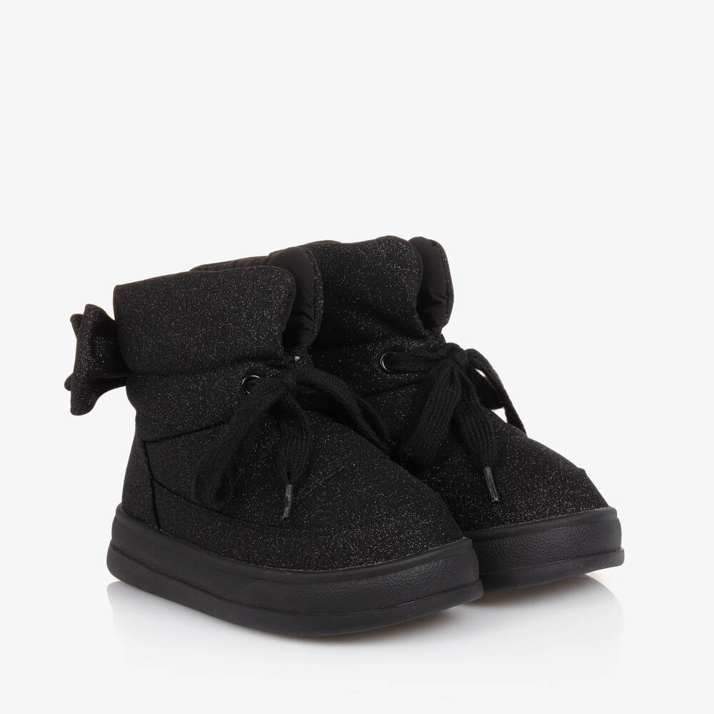 Gorgeous glittery black quilted ankle boots for girls from Monnalisa, with a decorative bow and embroidered logo on the back. For extra warmth, they are lined in soft and cosy faux fur, with a drawstring fastening providing an adjustable fit. The chunky, non-slip rubber outer sole ensures good grip on slippery surfaces.