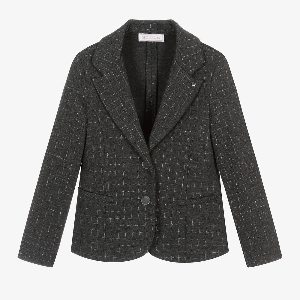 A dark grey viscose-mix blazer for girls by Italian label Monnalisa, made in soft, sleek Milano jersey. Effortlessly chic, it has a shimmering silver checked print, faux pockets, and tonal buttons to fasten on the front. Tailored and structured, this stylish layer has a silver heart detail on the lapel.
