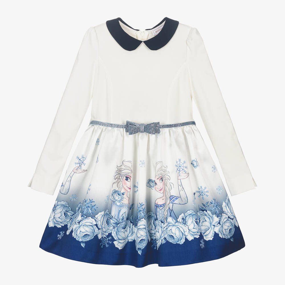 From Monnalisa, an ivory dress for girls with a soft viscose blend jersey bodice and silky skirt. Printed with Elsa from Disney's Frozen along the bottom, this charming dress has a tulle underskirt to create volume and a sparkly belt for an elegant finish.