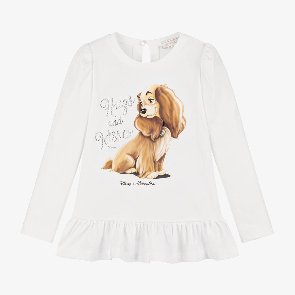 A lovely ivory top for girls by Monnalisa, made in soft cotton jersey. From Disney's Lady and the Tramp, it features the beautiful Lady on the front, with the words 'Hugs and Kisses' in sparkling diamantés. This tunic-style top has gently puffed long sleeves, a pretty frilled hem, and a keyhole button fastening on the back.