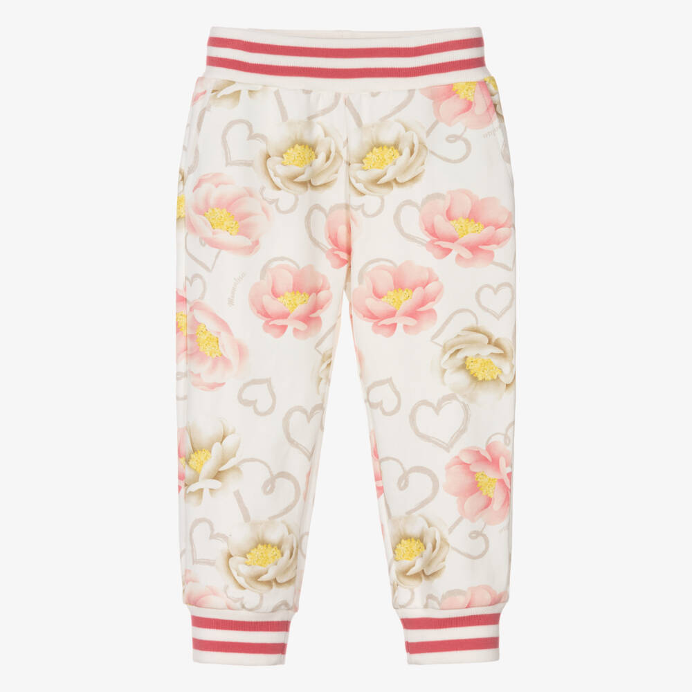 Ivory cotton joggers for girls by Italian designer Monnalisa, printed with pink, ivory and yellow flowers, grey hearts and logos. Made in comfortable, soft, sweatshirt jersey with an elasticated waist, they have cosy, ribbed, pink-striped trims for comfort and useful side pockets.
