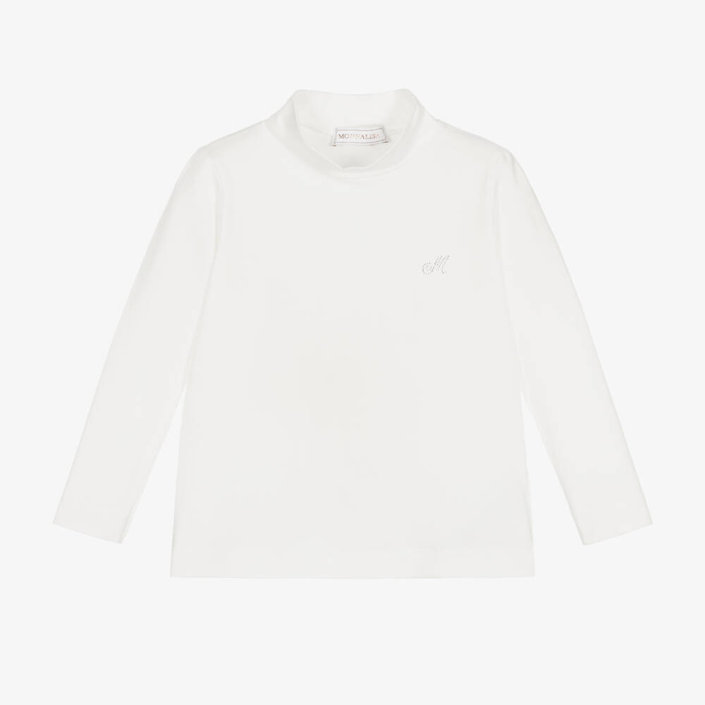 Lovely ivory cotton top for girls by Italian brand Monnalisa. Made in a soft and stretchy jersey, this long-sleeved, roll-neck style is ideal to wear alone or as a layering piece. For an extra girly touch, there is a sparkling diamanté logo on the chest.