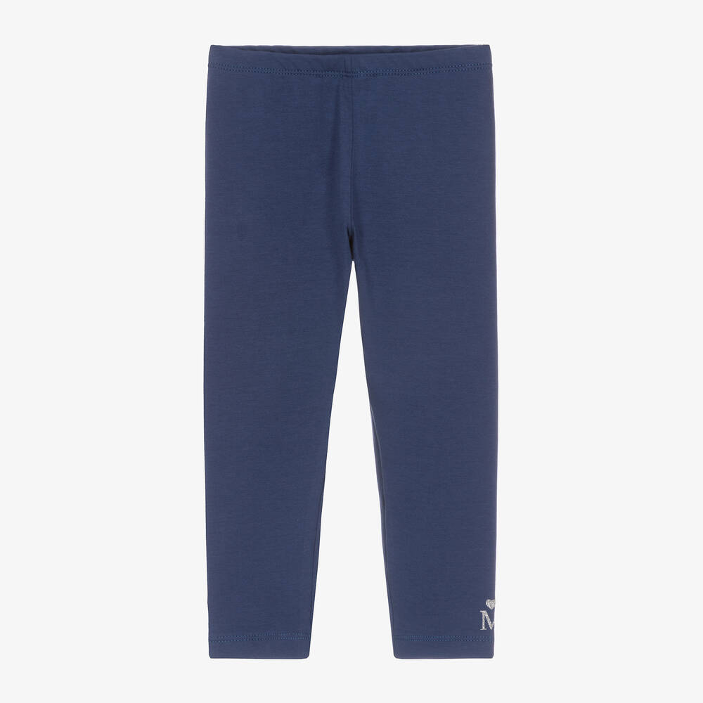 Navy blue leggings for girls by Monnalisa, made in soft and stretchy cotton jersey. Casual and easy wearing, these long leggings have a comfortable elasticated waistband and a glittery silver logo and heart print on one ankle for a sparkly branded finish.