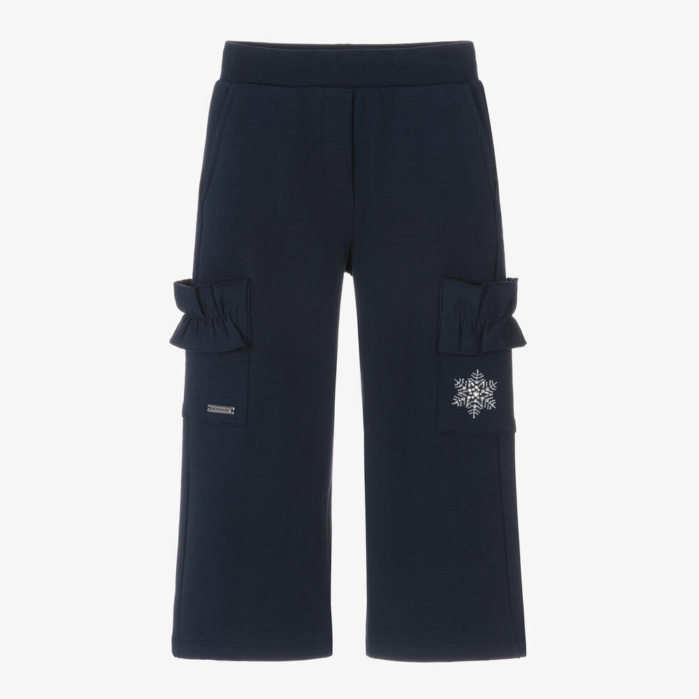 Cool navy blue joggers for girls from Monnalisa, made in soft cotton jersey. The relaxed, wide-leg fit and elasticated waist means they are comfortable and easy to wear. The side pockets have sweet ruffle detailing and are embellished with a diamanté snowflake.