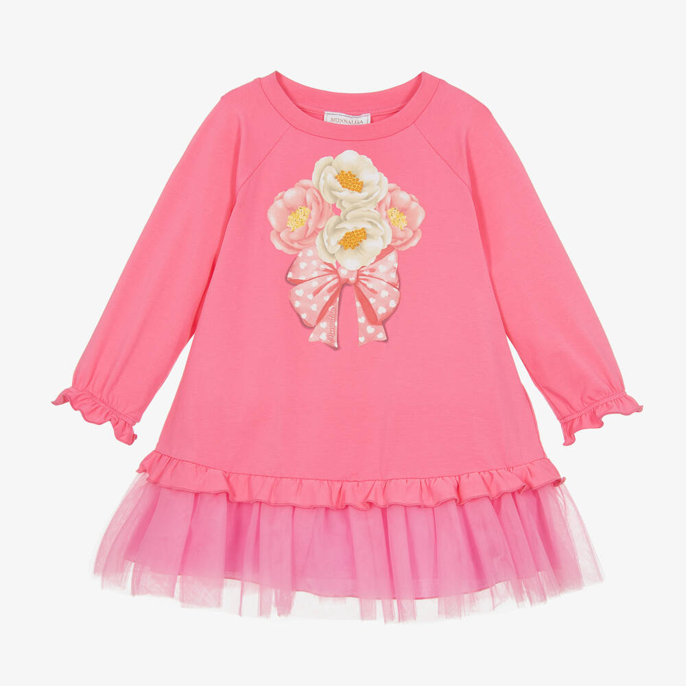 Bright pink cotton dress for girls by Italian designer Monnalisa, both comfortable and stylish. On the front, it has a bunch of flowers in pink and white, sparkling with yellow diamantés and tied together with a logo bow that has a white heart print. There are frills on the gently elasticated cuffs and the drop-waisted, tulle skirt, which is lined in voile for comfort. Easy to wear, it simply pulls on.