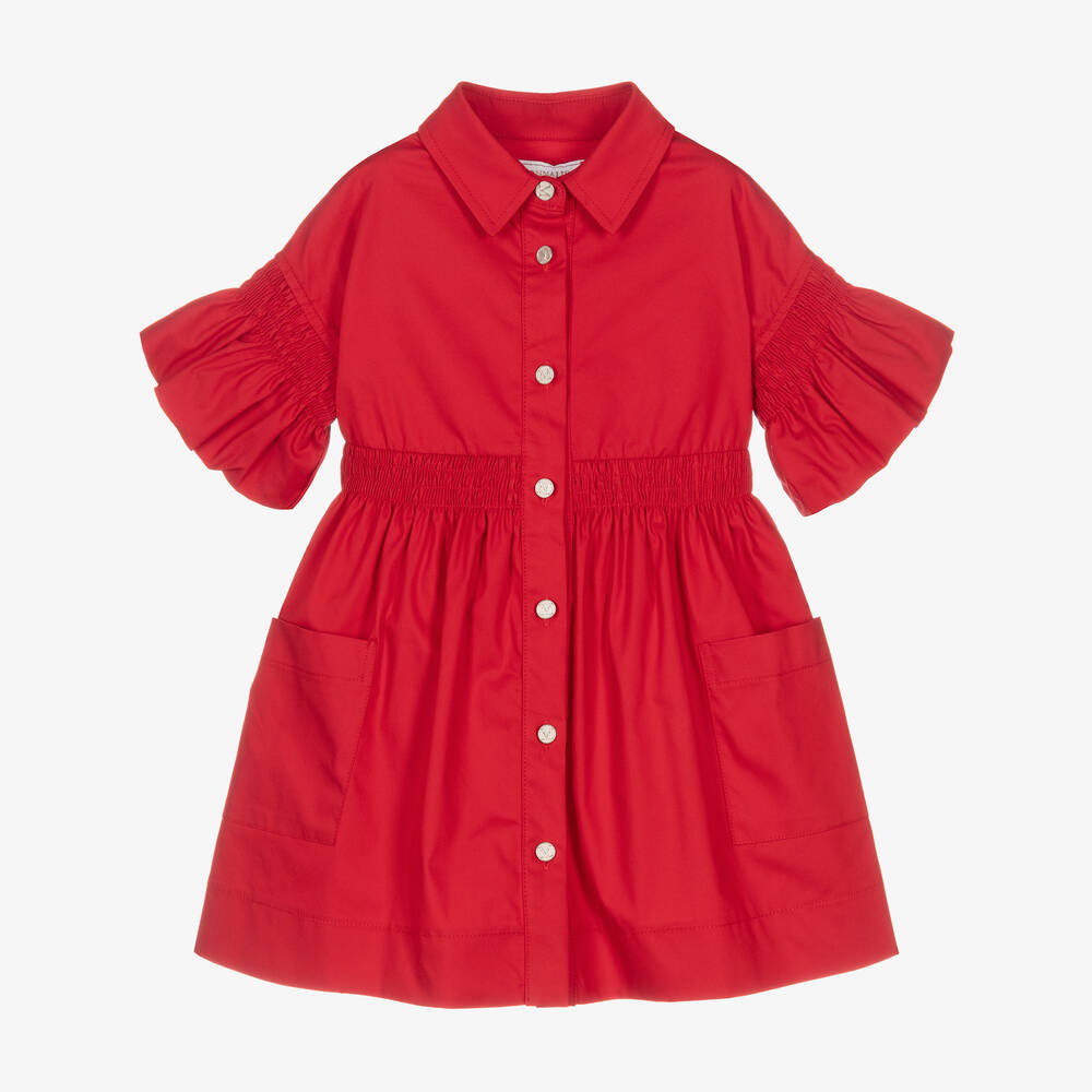 Red cotton shirt dress for girls by Monnalisa, with stylish ruched detailing and ruffled cuffs. Made in lightweight twill, it has shiny silver monogram button fastenings and front patch pockets.