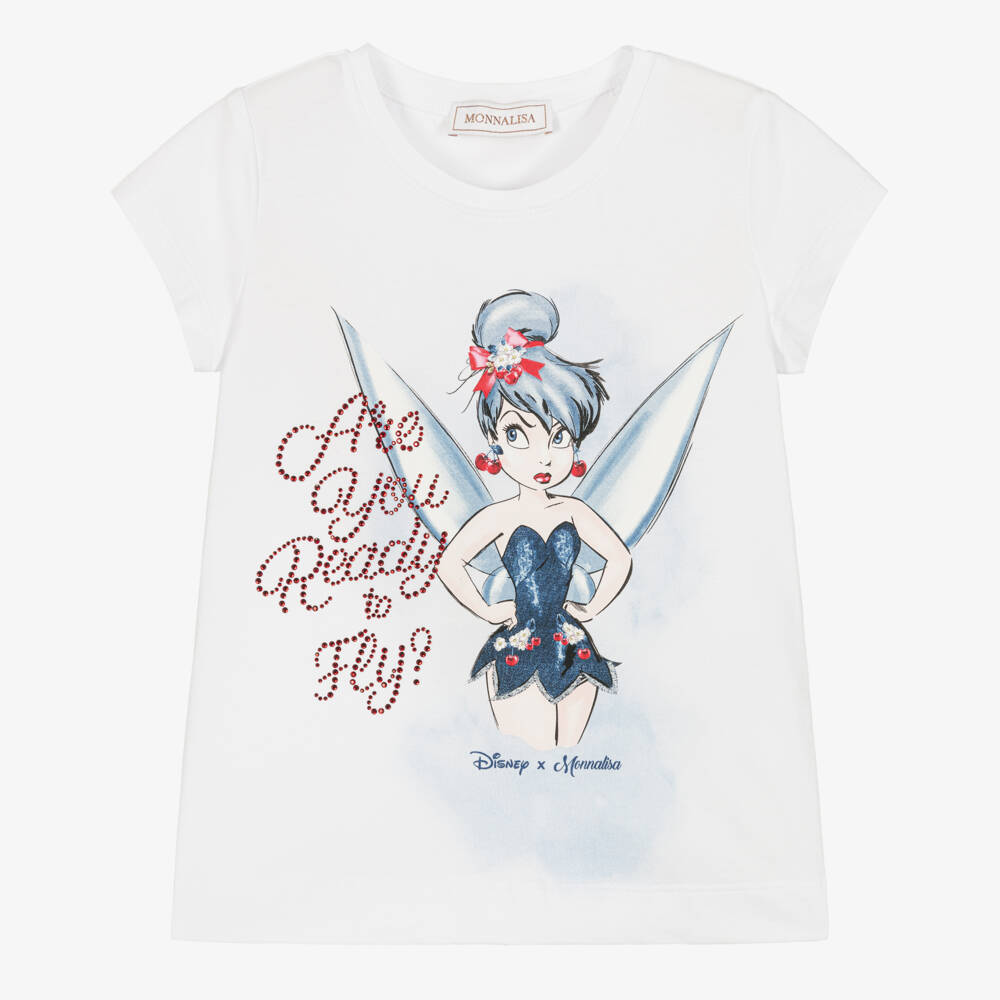 Gorgeous white T-shirt for girls by Italian designer Monnalisa, made in luxuriously soft cotton jersey. This top has an adorable Tinker Bell print on the front, wearing an edgy denim dress and cherry earrings. For added statement and glamour, it has an 'Are you Ready to Fly?' slogan patterned in red diamantés.