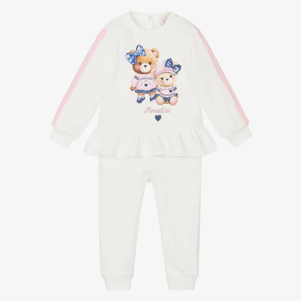 A white cotton jersey tracksuit for little girls by Monnalisa, with a cosy fleecy inside. The sweatshirt has a frilled hem and two adorable teddy bears on the front, one with a 3D dotted bow on her head. There is a sparkly pink logo on the front and easy-fastening poppers on the back. The matching joggers have pink and blue logo embroidery on the back and useful slanted front pockets. They have a gently elasticated waist for comfort and easy pull-on.
