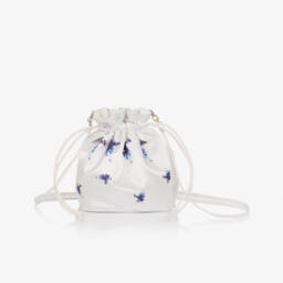 A white straw shoulder bag for girls by Monnalisa. Ideal for the beach, this fun design is decorated with a trio of blue hearts on the front. The single compartment is lined in navy blue fabric, and has two carry handles and a fixed shoulder strap. A silver metal logo heart charm adds a subtle designer finish.