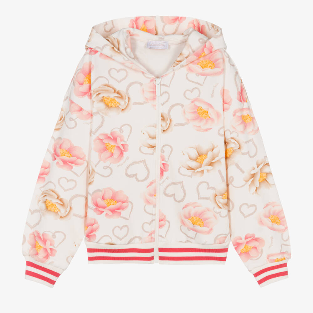 Ivory zip-up hoodie for teen girls by Italian designer Monnalisa. For a subtle designer look, script logos are scattered throughout the pretty pink and ivory floral heart print. Casual and comfortable to wear, it is made in soft cotton jersey, with pink striped trims and a lined hood. It fastens with an exposed front zip and logo pull tab and has concealed front pockets.