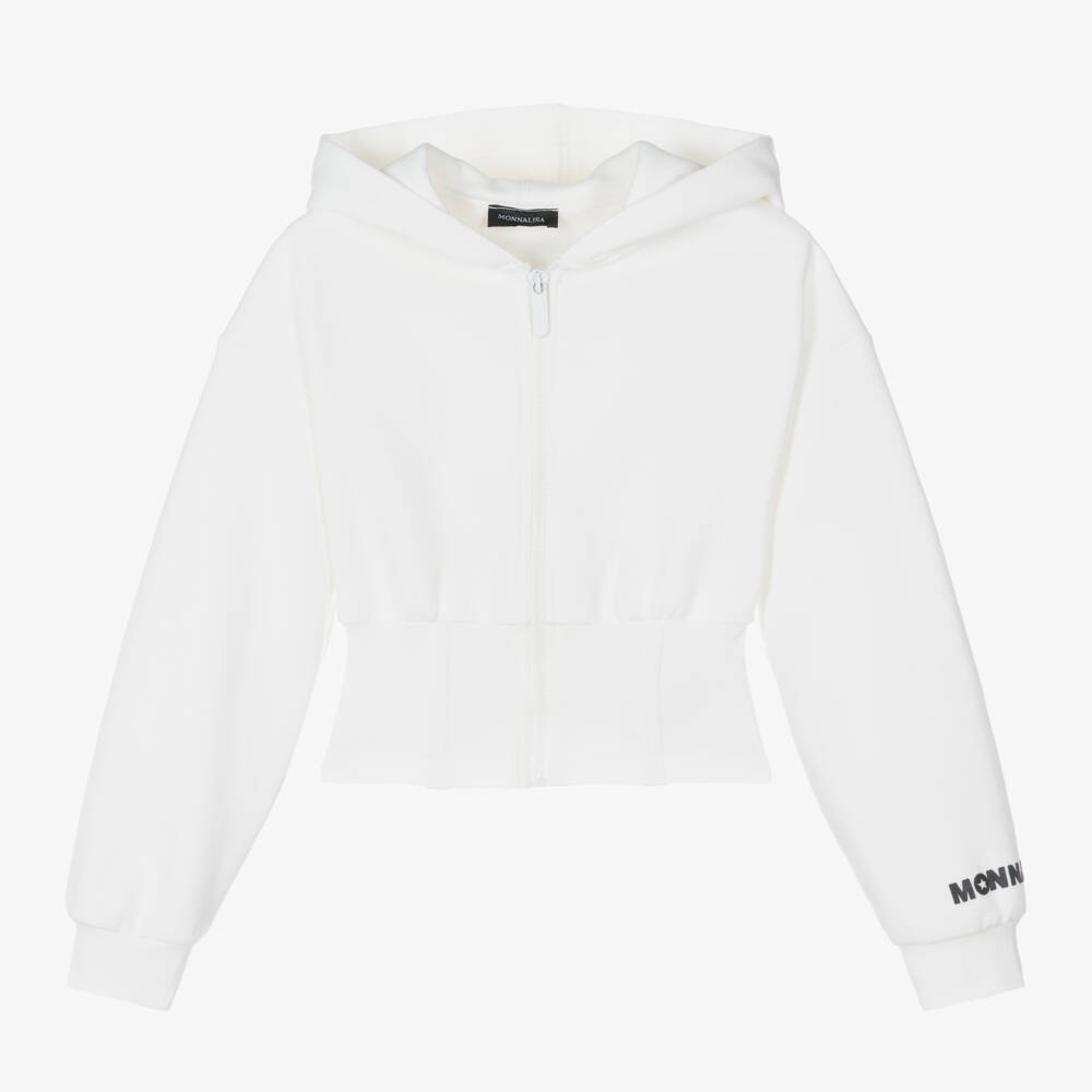 Ivory zip-up top for teen girls by Italian label Monnalisa, with a black, rubberised logo on one arm. Great for casual styling, this hooded top is designed with an elasticated, structured hem which is slim fitting on the waist. It has a branded zip pull, lightly ribbed cuffs, and a warm fleecy inside for maximum comfort.