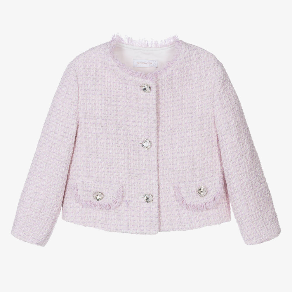 A smart lilac pink bouclé tweed jacket for teen girls by Monnalisa. With a classic boxy shape, the softly textured fabric is woven with silver thread to give a shimmery effect. In a cropped length, there are sparkly crystal buttons to fasten and a raw-edged rounded collar and matching frayed edges on the pocket flaps.