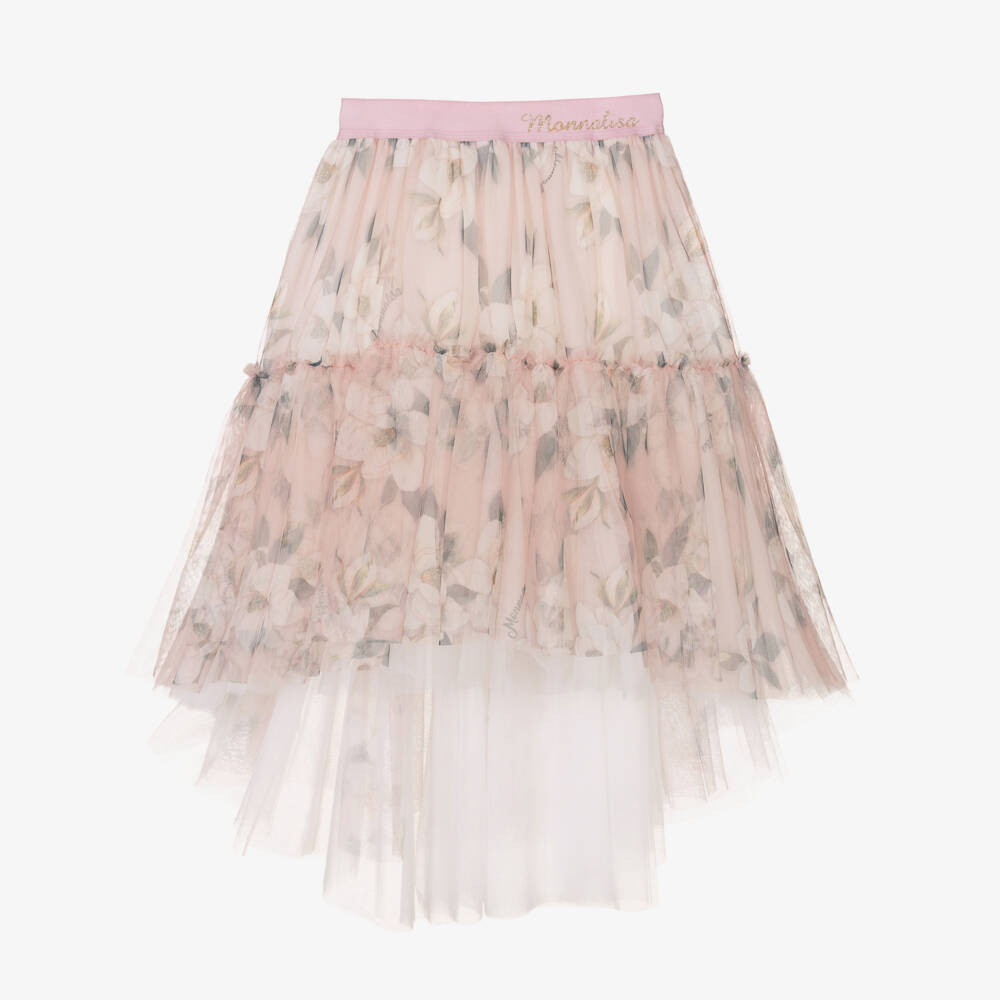 Beautiful pale pink tulle skirt for teen girls by Monnalisa. This elegant special occasion design is made in soft tulle with an ivory and green floral logo print. There is a full, gathered skirt with a high-low hem, revealing white tulle underskirts for volume and shape. The stretchy pink waistband has a gold glitter logo print and is designed for comfortable wear.