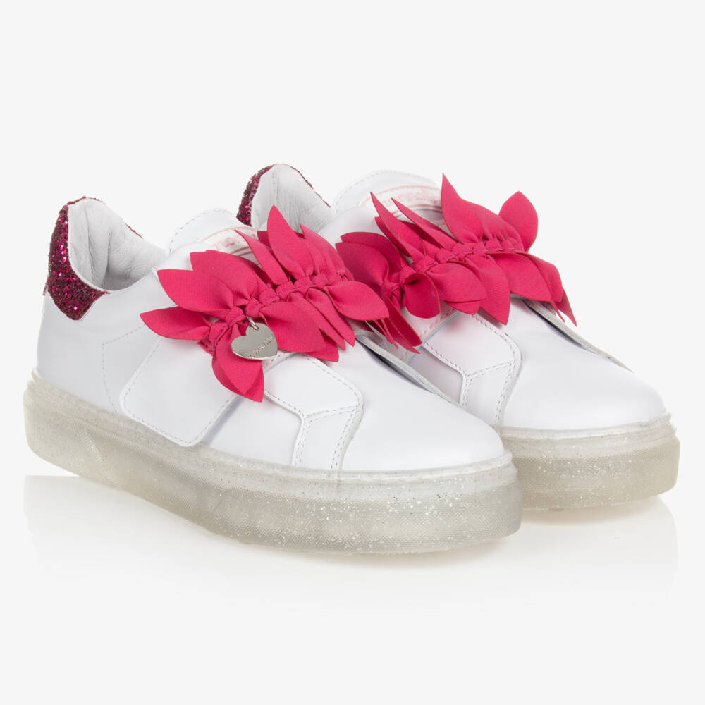 Super quirky white and dark pink leather trainers for teen girls from Italian brand, Monnalisa. The uppers centre around pink fabric petals and a silver logo heart charm, with a sparkly sequin heel trim. Made in premium quality leather, they fasten easily with velcro and have a glittery clear rubber sole. Soft leather also occupies the lining and insole, for a comfortable feel.
