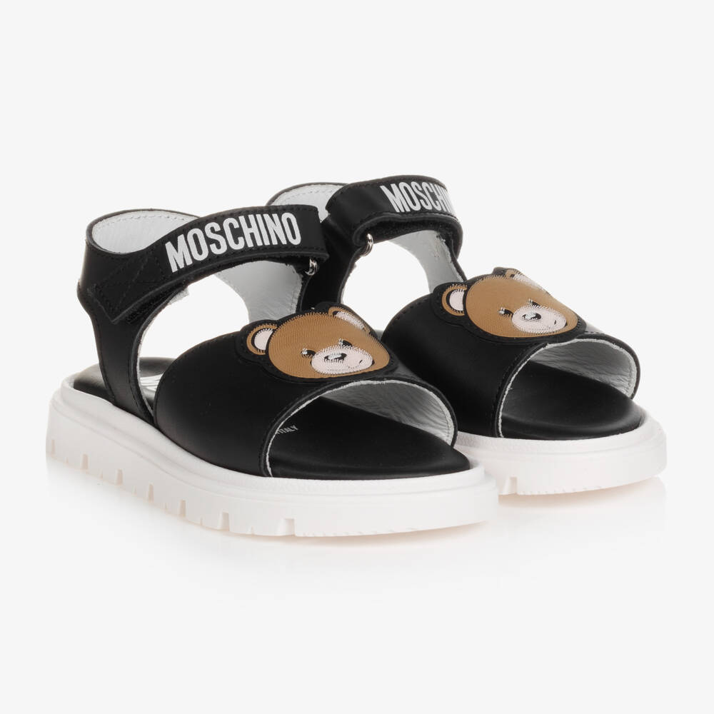 Black sandals for baby girls by Moschino Baby, made in soft and supple leather. Adding a contemporary touch to any outfit, these open-toe sandals have a textured Moschino Teddy Bear logo on the front and the designer name across the velcro strap. They have a gently padded leather insole and a white rubber outsole for added traction on slippery surfaces.