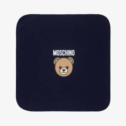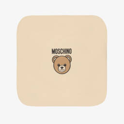 A beige cotton blanket for baby boys and girls by Moschino, with a cute brown Moschino Teddy Bear and black logo print. Soft and cosy for the nursery or an extra layer in the pram when out and about, it is made in a double layer of jersey with a piped trim. An embroidered black and white logo patch adds extra designer flair.