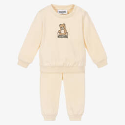 Beige tracksuit for little boys and girls by Moschino, made in soft cotton jersey with a warm, fleecy feel inside. Both pieces feature the brand's signature Teddy Bear logo print for instant designer appeal. The ribbed crew neckline has additional snap fastenings on one shoulder to help with dressing, while the joggers have an elasticated waistband, ensuring a comfortable fit.