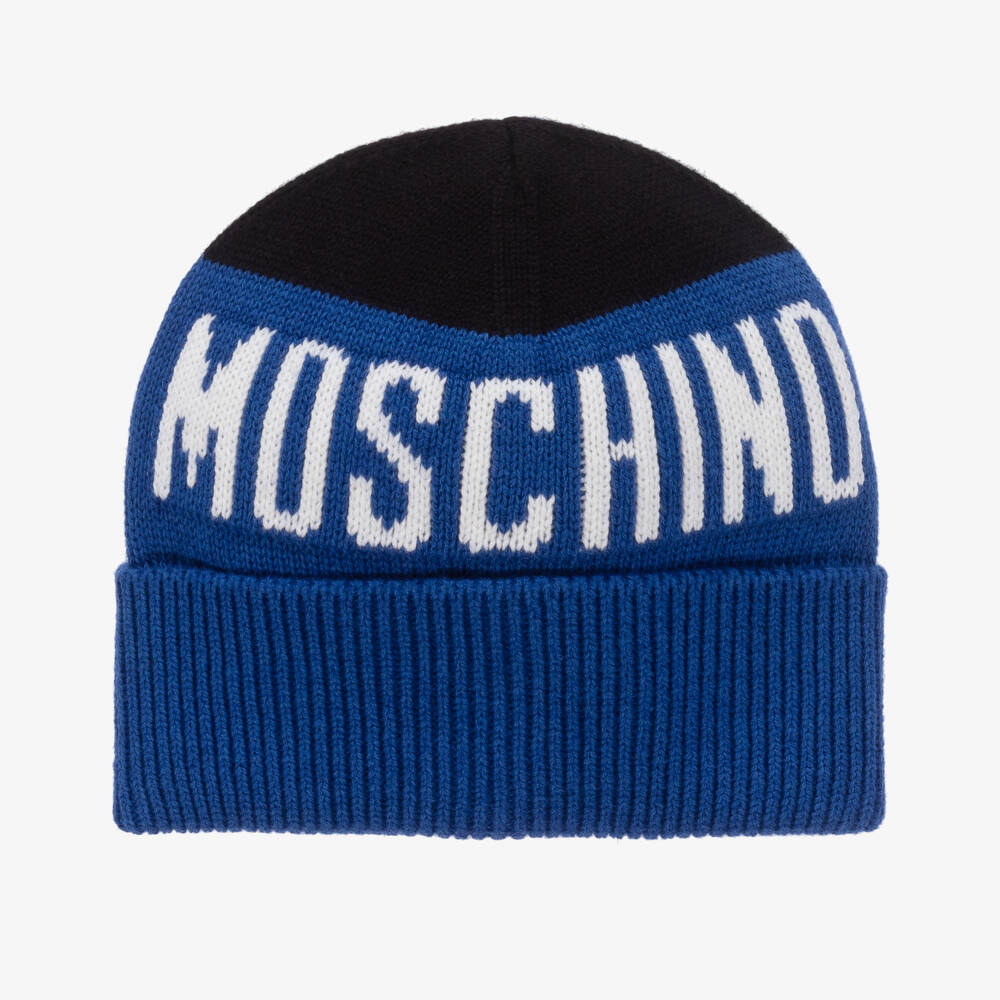 Cool blue and black beanie hat for boys and girls from Moschino Kid-Teen. Knitted in a luxuriously warm cotton and wool blend, it has a bold white jacquard logo across the front and a ribbed turned-up brim.