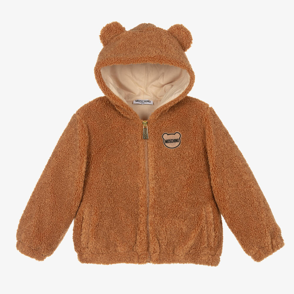 Brown teddy fleece zip-up hooded jacket for little boys and girls by Moschino Baby. Cosy and comfortable, it has a soft cotton jersey lining and is elasticated around the hem and cuffs for a snug fit. There are concealed front pockets, with a gold-tone branded zip puller and a transparent rubberised logo on the chest for a signature finish.
