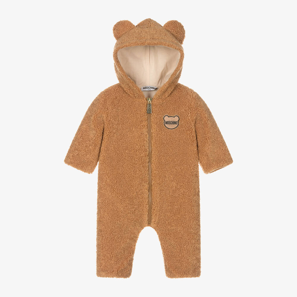 Warm and cosy, a pramsuit for baby boys and girls by Italian brand Moschino Baby, made in soft, tan brown teddy fleece. Lined in comfortable jersey, it has a fixed hood with 3D teddy ears on the top for a super cute look. There is a zip fastening on the front with a branded gold pull and a rubberised Teddy Bear logo patch on the chest.