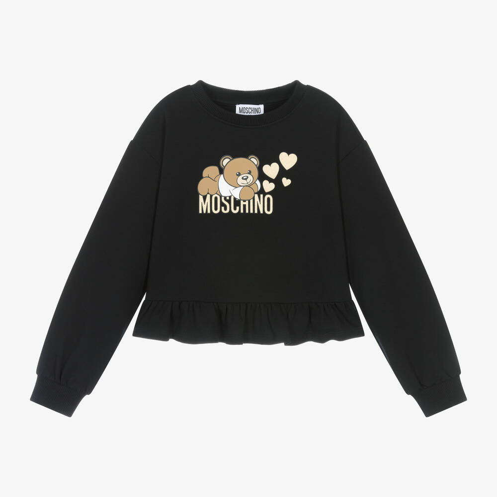 Black cotton sweatshirt for girls by Moschino Kid-Teen, in a stylish boxy fit with a ruffle hem. Made in soft and comfortable jersey, it has a cute Moschino Teddy Bear love heart design on the front, along with a gold logo print for a sweet designer look. A crew neckline and lightly ribbed trims complete the casual look.