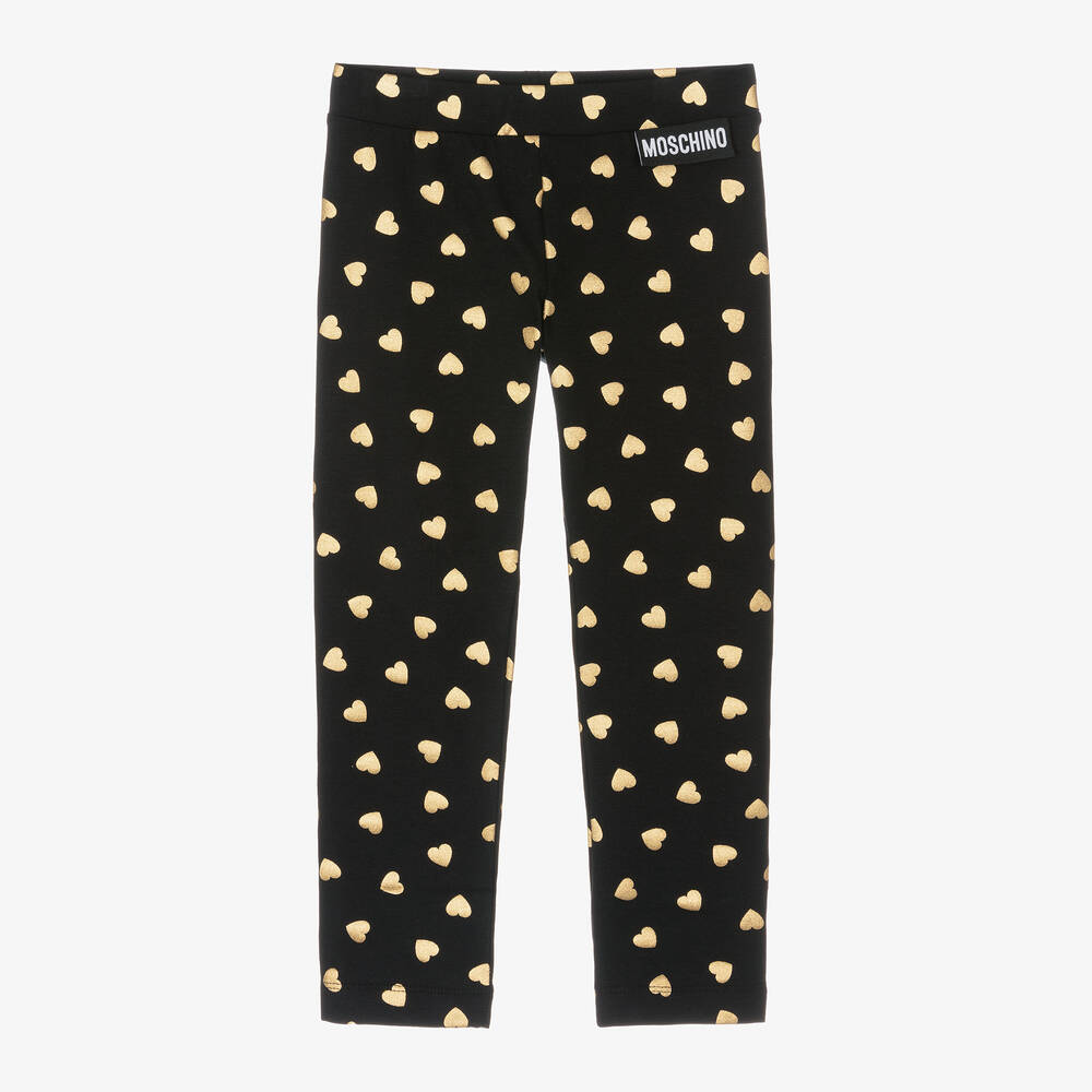 Lovely black cotton leggings for girls by Moschino Kid-Teen, patterned with shimmery gold hearts. They are made in soft and comfortable jersey in a full length, with a bold black and white logo tab by the elasticated waistband.