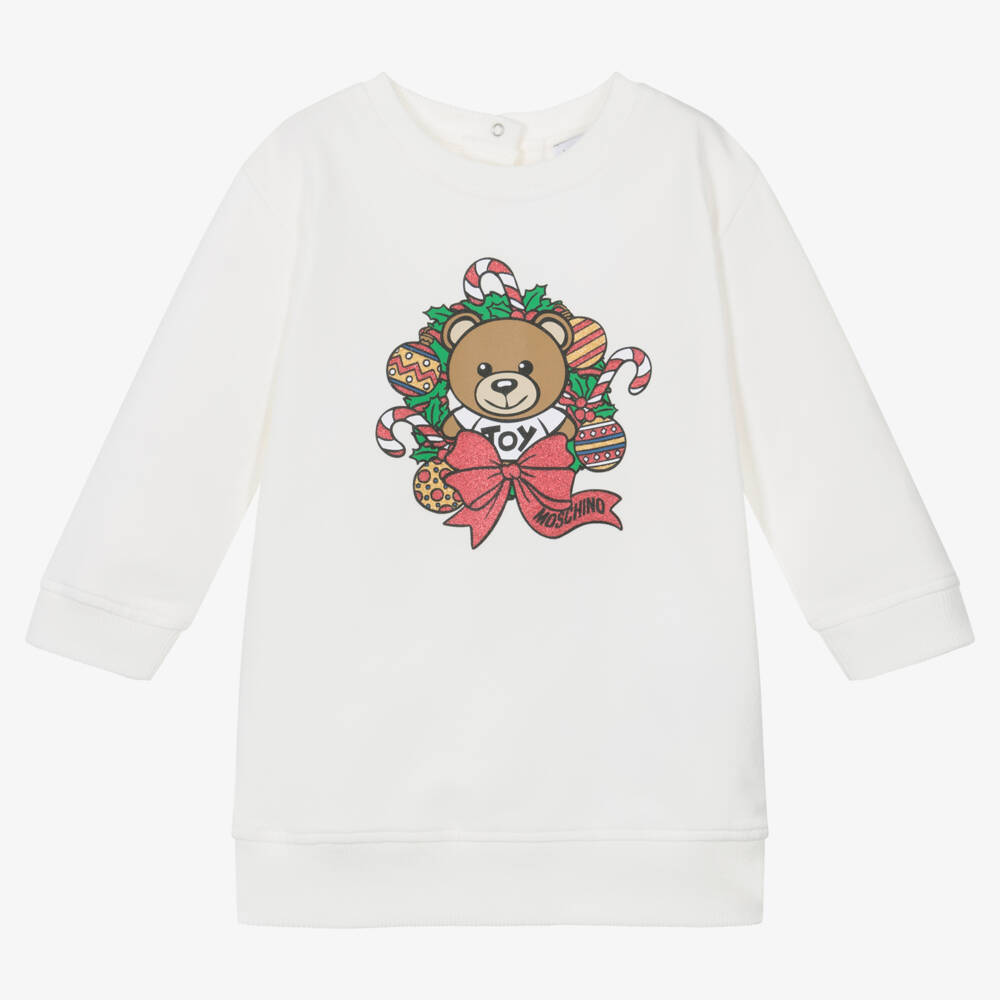 Cute ivory sweatshirt dress for little girls by Moschino Baby, made in soft cotton jersey with a warm, fleecy inside. Comfortable and easy to wear, this sweet dress has a glittery, festive, Moschino Teddy Bear print on the front. It has ribbed trims and popper fastenings on the back to help with dressing.