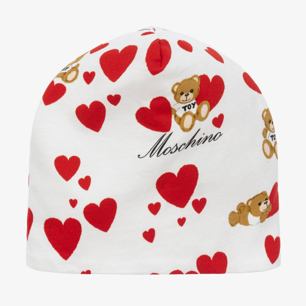 Ivory hat for girls by Italian brand Moschino Kid-Teen, made in a double layer of soft cotton jersey. This sweet beanie hat is patterned with gorgeous red hearts and features the brand's Moschino Teddy Bear logo for a cute designer finish.
