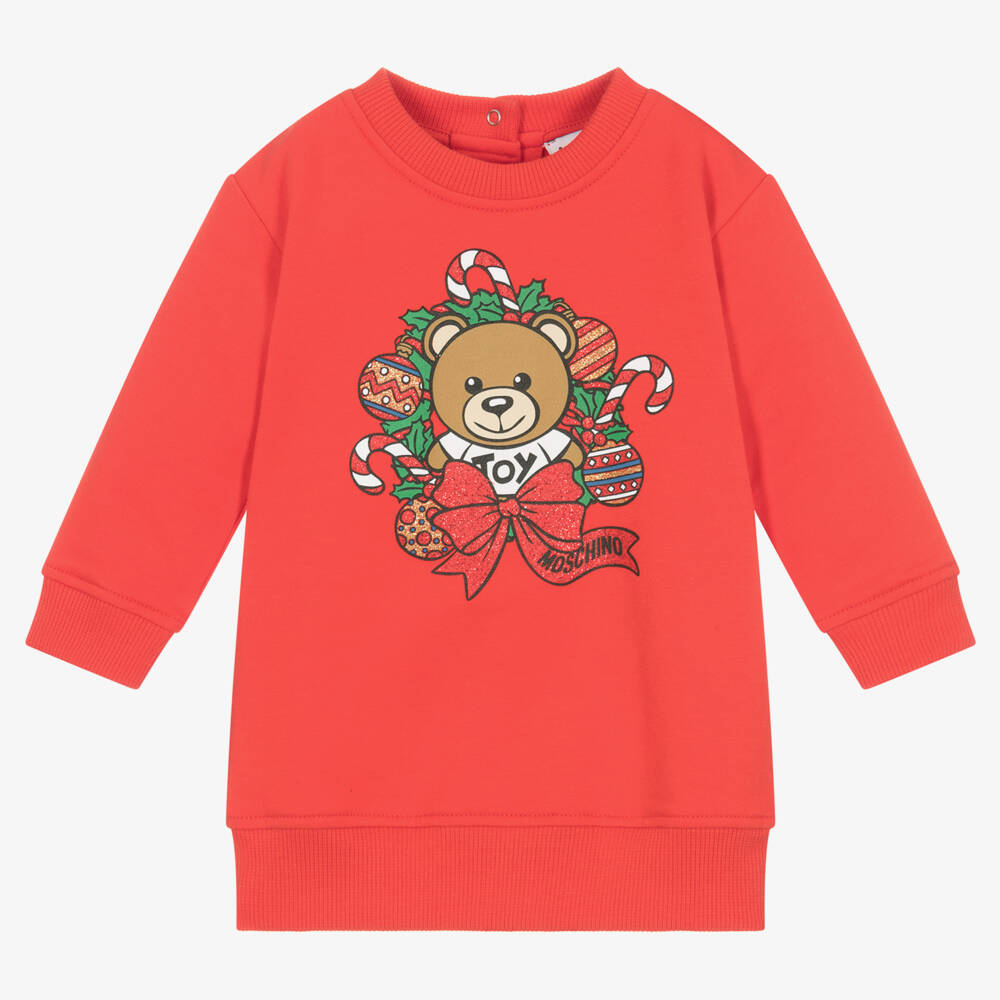 Cute red sweatshirt dress for little girls by Moschino Baby, made in soft cotton jersey with a warm, fleecy inside. Comfortable and easy wearing, this sweet dress has a colourful and glittery festive-themed Moschino Teddy Bear and logo on the front. It has ribbed trims and popper fastenings on the back to help with dressing