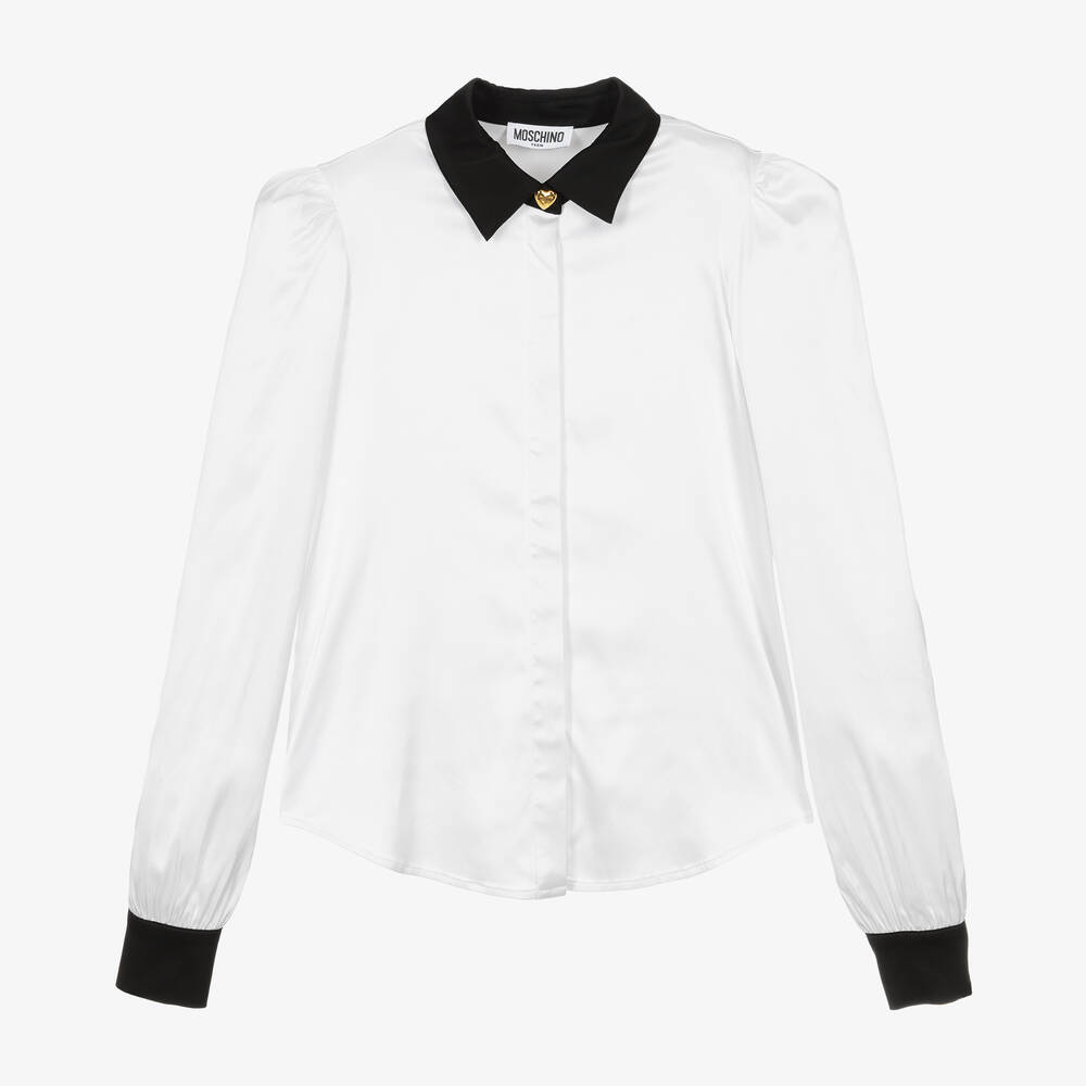 Mini-me white blouse for older girls by Moschino Kid-Teen, made in silky viscose satin. With a gorgeous sheen, this stylish top has a contrasting black collar and cuffs, which fasten with a heart-shaped gold logo popper. The long sleeves are gently puffed and, for a neat finish, there are concealed button fastenings on the front.