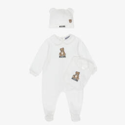 This ivory babysuit set by Moschino features the brand's iconic Teddy Bear motif and black logo print. Made in soft cotton jersey, the set includes a long-sleeved babygrow with a charming white collar, a matching bib, and a cosy hat with adorable ear details. The babygrow fastens with poppers on the back and the bib has an easy popper fastening on the side.