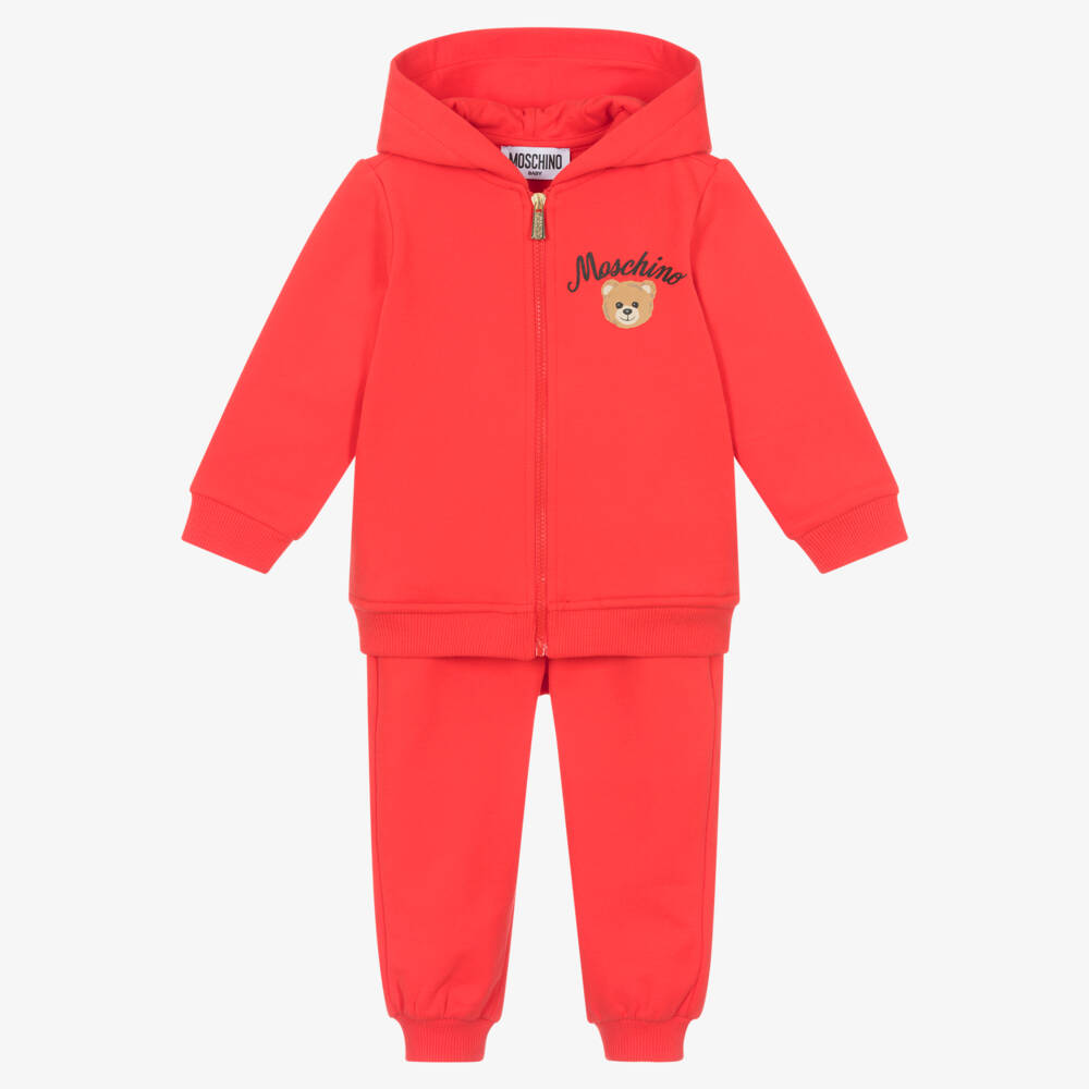 Red tracksuit for little boys and girls by Moschino Baby. Both pieces are made in super-soft and stretchy, brushed cotton jersey for cosy comfort on delicate skin. The hoodie has an easy-to-fasten front zip with a gold-tone branded pull, side pockets and a cute Moschino Teddy Bear logo print on the front. The joggers have an elasticated waist and a matching logo graphic for a coordinated look.